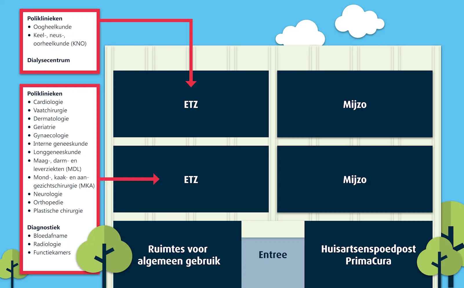 De ziekenhuiszorg in ETZ Waalwijk is al verplaatst naar de voorzijde van het gebouw. Binnenkort wordt de laagbouw aan de achterzijde gesloopt om plaats te maken voor Florissant – Centrum voor gezondheid en herstel. Zodra dit gereed is, verhuizen het ETZ, PrimaCura en Mijzo naar deze nieuwe locatie.